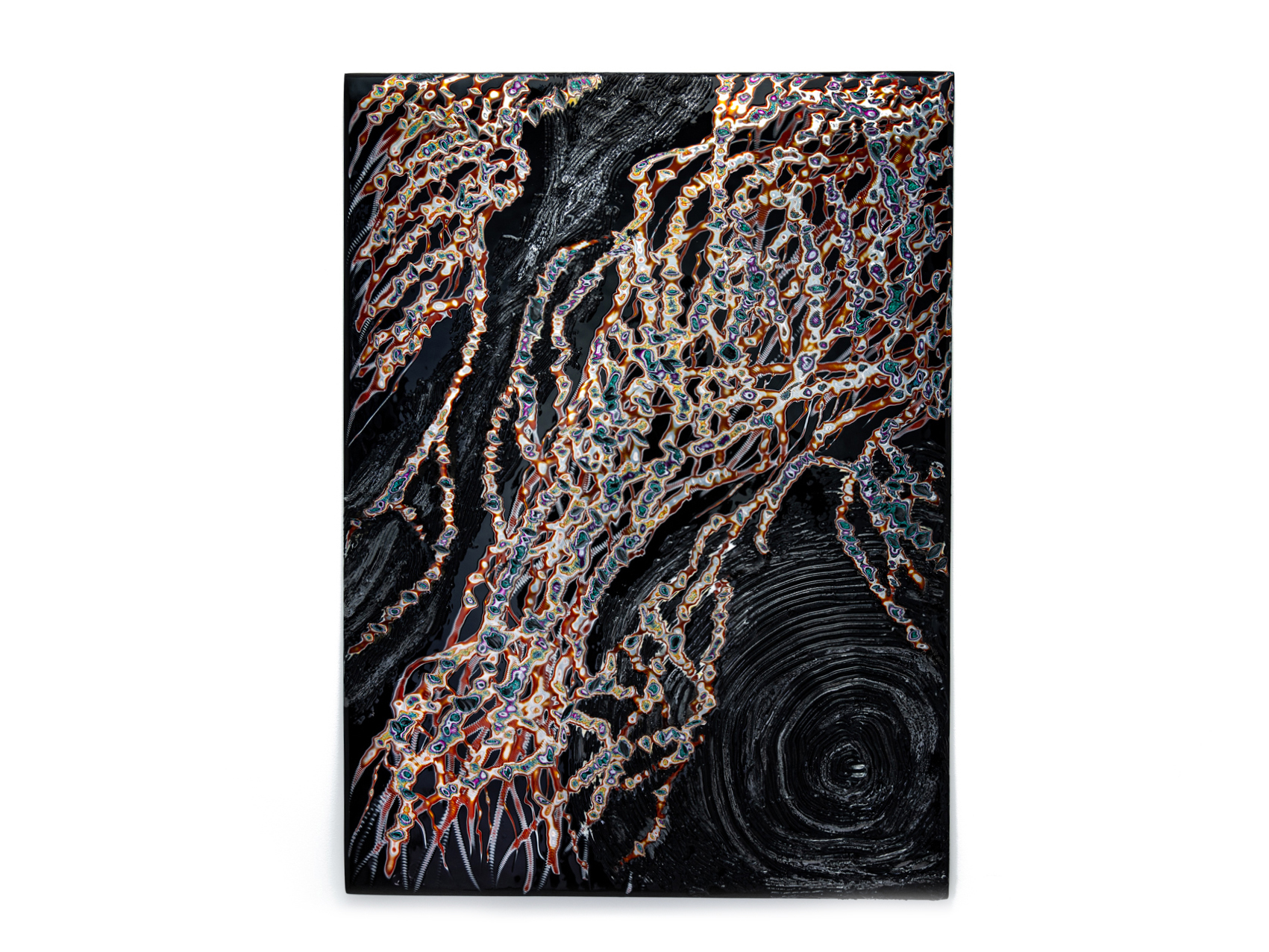 One of the most notable features of this work is the layering of paint, which consists of no fewer than 38 layers. These layers are not merely a physical accumulation; they represent the passage of time, a record of action, and function as a mechanism for generating visual depth.While each color remains distinct, they interpenetrate one another, resulting in complex and rich tones that could not be achieved by a single color alone. Although this color composition is left to chance, it ultimately achieves a high degree of harmony, blurring the boundary between the intentional and the unintentional.